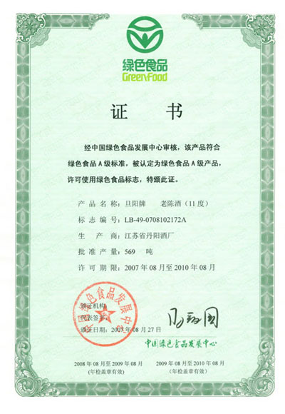 2007年8月丹阳封缸酒、老陈酒、黄酒继续被授予“A级绿色食品”