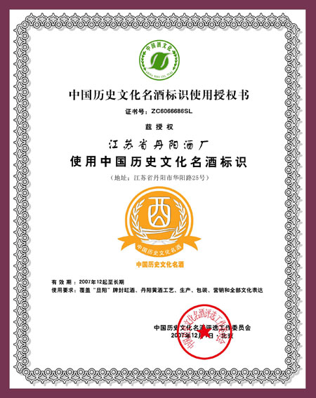 2007年12月“旦阳”牌封缸酒获“中国历史文化名酒”称号,其“中国历史文化名酒标识”使用权,覆盖“旦阳”牌封缸酒、丹阳黄酒工艺、生产包装、营销和全部文化表达。